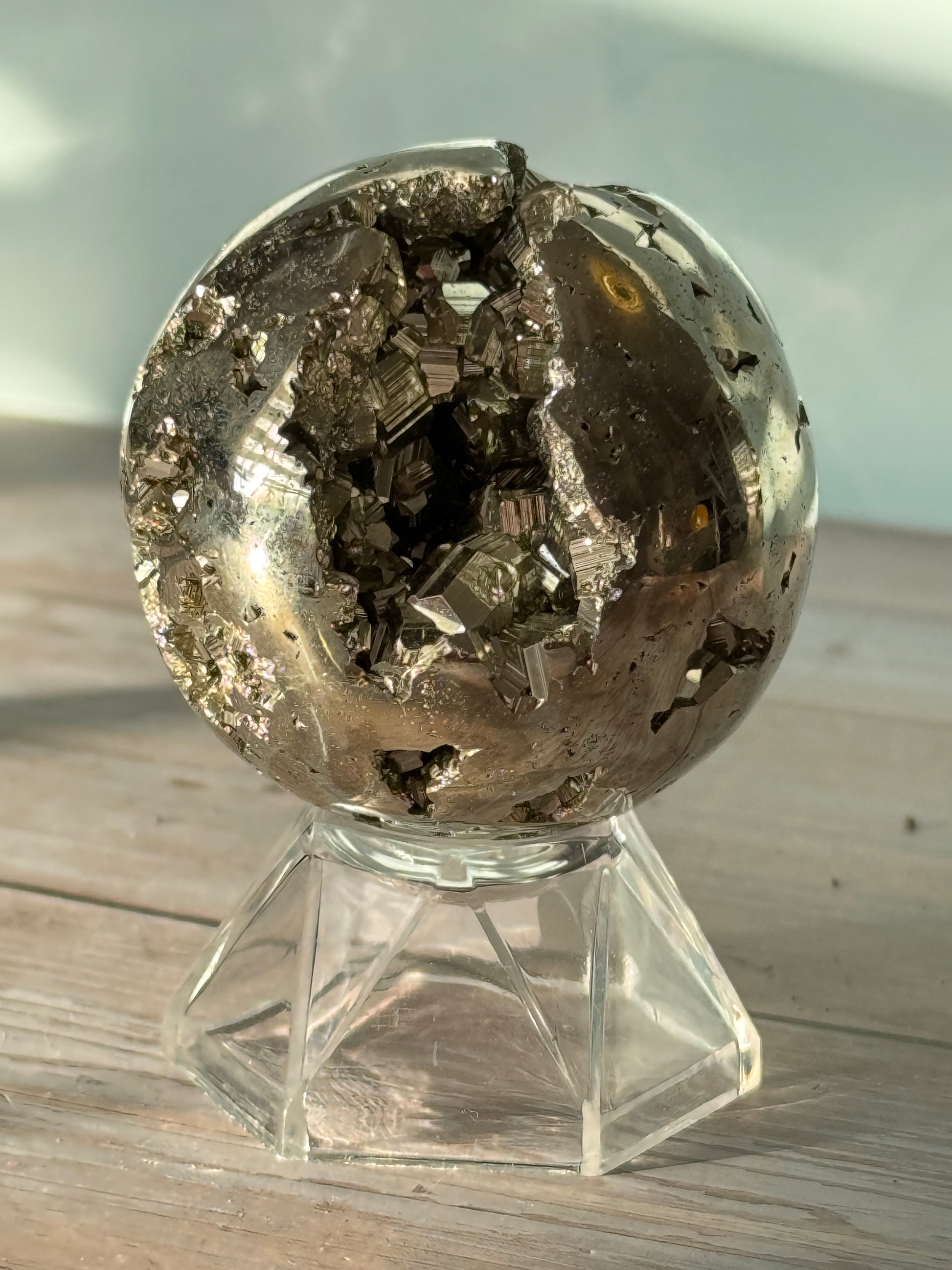 High Grade Pyrite is a stone of abundance, protection, and vitality. This polished sphere radiates strong, grounding energy, helping to boost confidence, focus, and motivation while shielding against negative influences. Perfect for intention setting, workspace energy, or display.