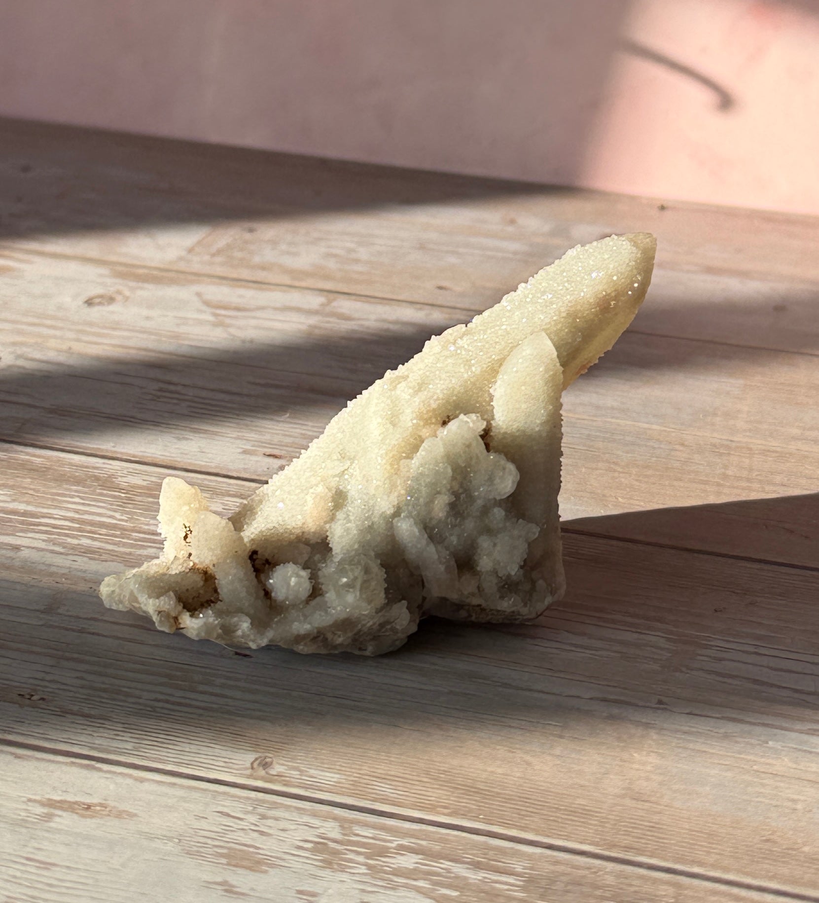 This Witch’s Finger is a druzy Spirit Quartz, radiating sparkling, high-vibration energy that supports spiritual growth, clarity, and manifestation. Its unique, elongated shape channels energy with focus and precision, making it perfect for meditation, intention work, and energetic empowerment.