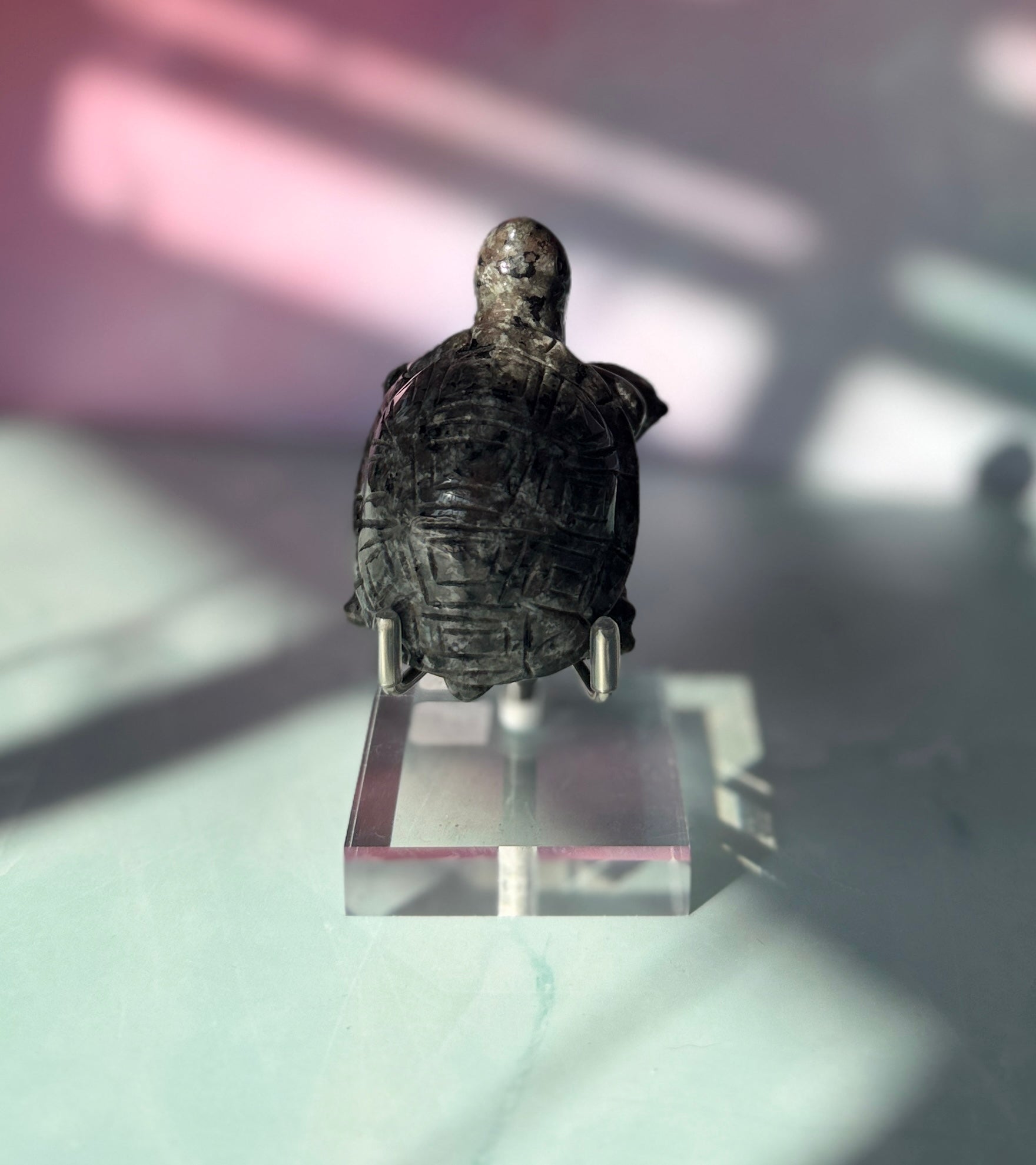 Yooperlite is a fluorescent variety of sodalite discovered along the shores of Lake Superior. It is often associated with truth, self-expression, and inner clarity. The turtle symbolizes patience, wisdom, and steady progress.